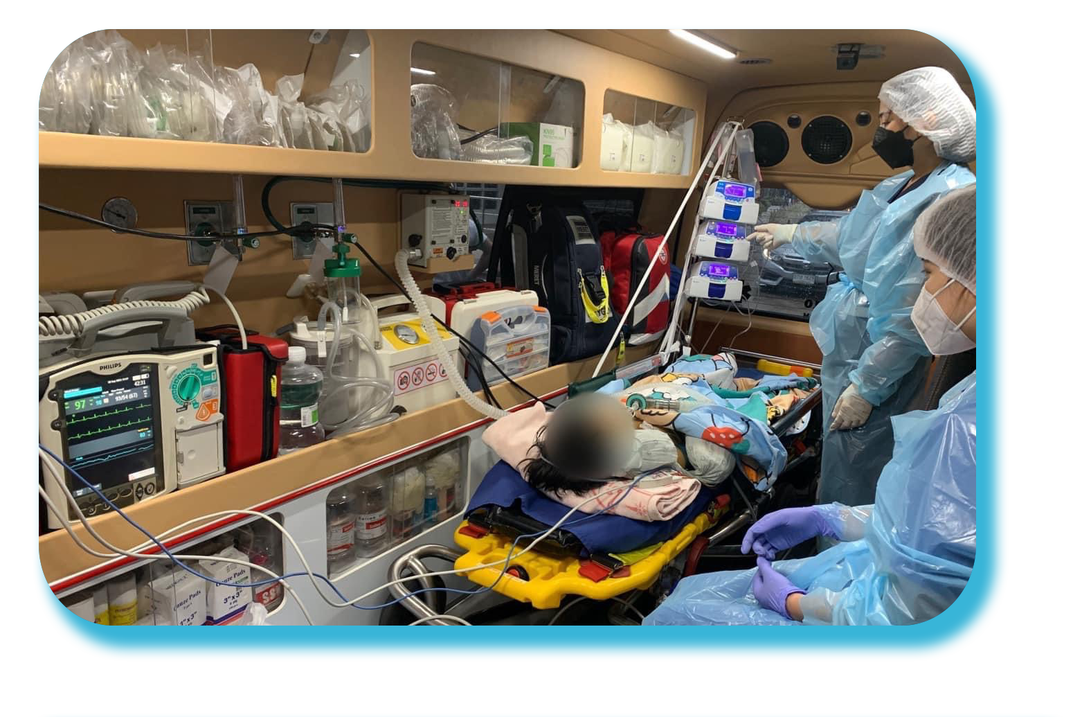 รถพยาบาลเรามีอุปกรณ์เครื่องมือ และอุปกรณ์ทางการแพทย์ ที่ได้รับรองมาตรฐานจากยุโรป และสหรัฐอเมริกา เพื่อใช้ในระหว่างการเคลื่อนย้าย และติดตามสัญญาญชีพ เพื่อป้องกันภาวะแทรกซ้อนที่หากจะเกิดขึ้นในระหว่างการเคลื่อนย้าย